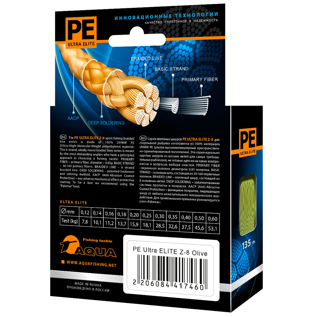 Купить Плетеный шнур для спиннинга AQUA PE ULTRA ELITE Z-8 0,18 мм 135 м, цвет - оливковый, test - 13,70 кг