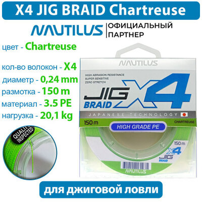 Купить Шнур Nautilus X4 Jig Braid Chartreuse d-0.24мм 20.1кг 3,5PE 150м