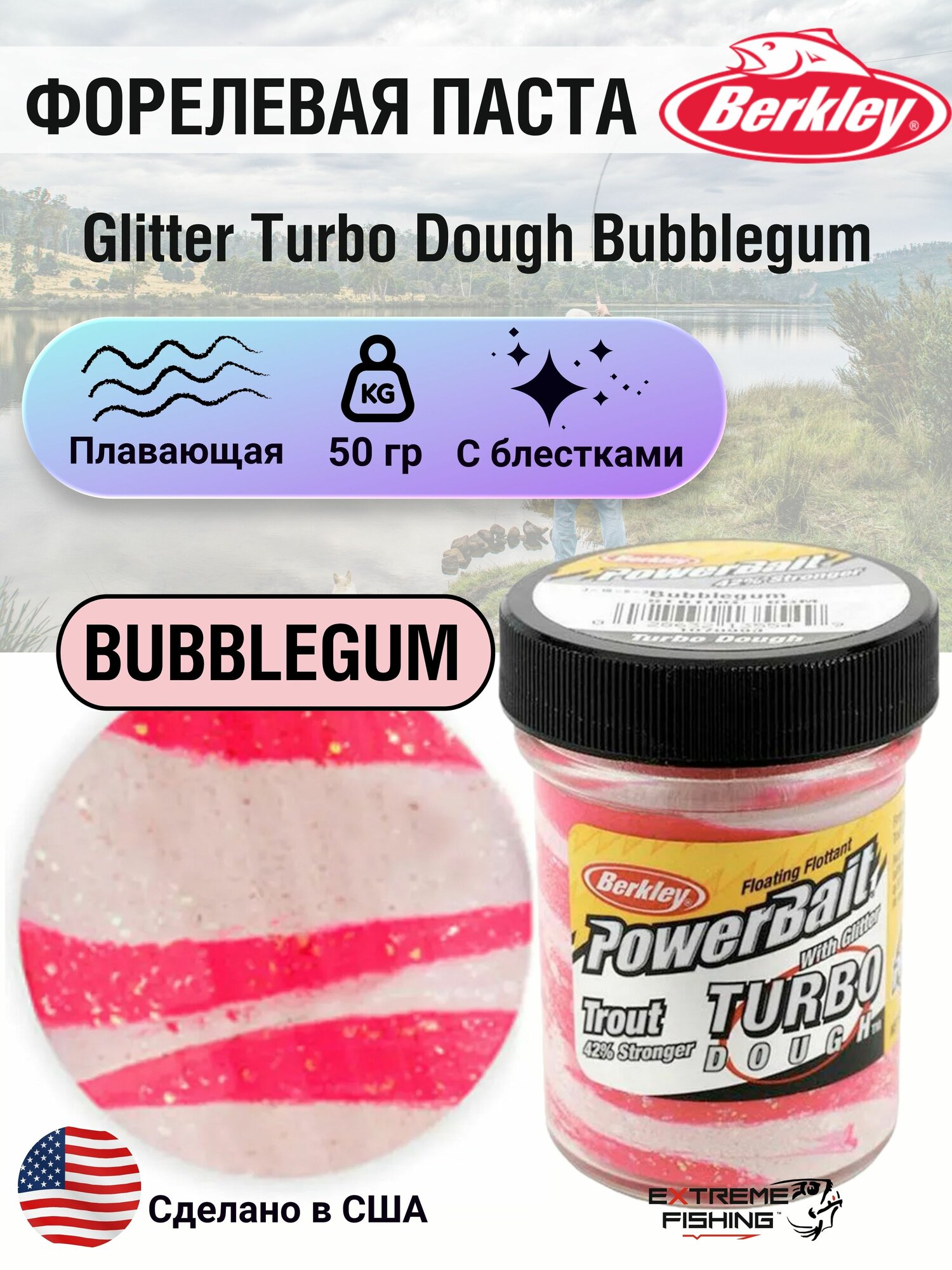 СохранитьПаста форелевая двухцветная розово белая Berkley Glitter Turbo Dough Bubblegum интересное: