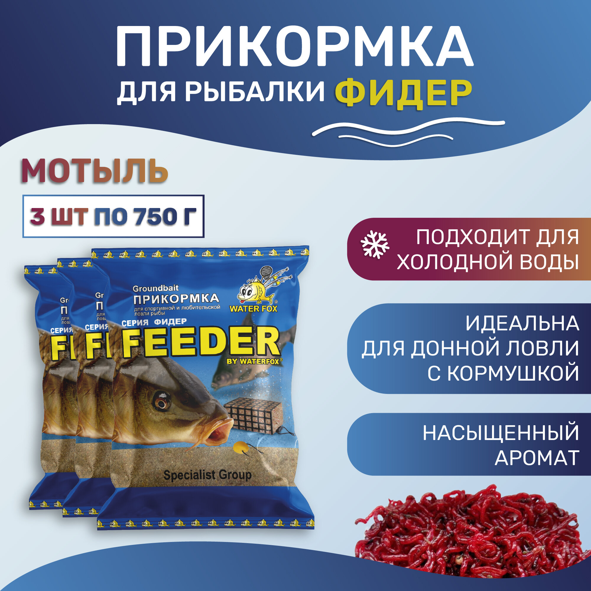 Прикормка для рыбалки натуральная WATER FOX Серия Фидер Мотыль 3шт по 750 г интересное: