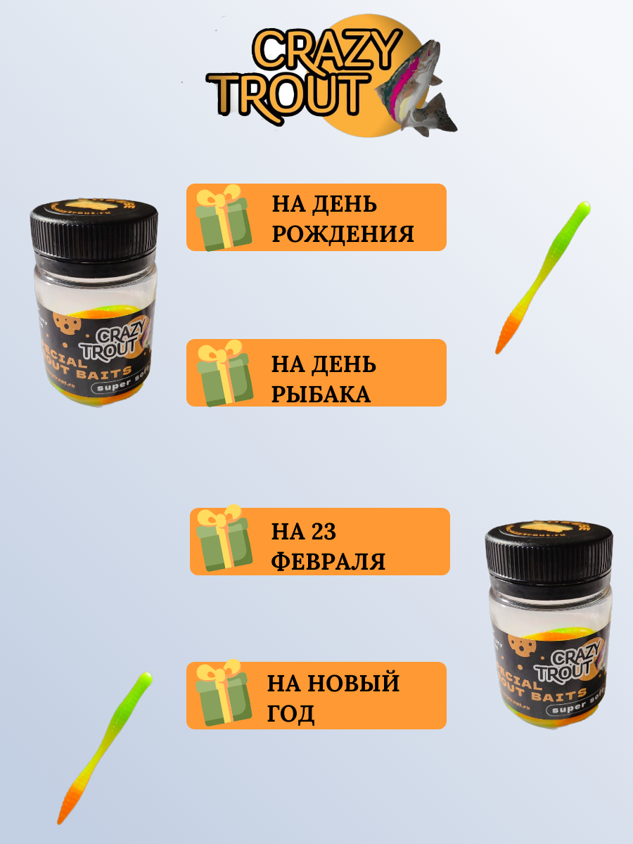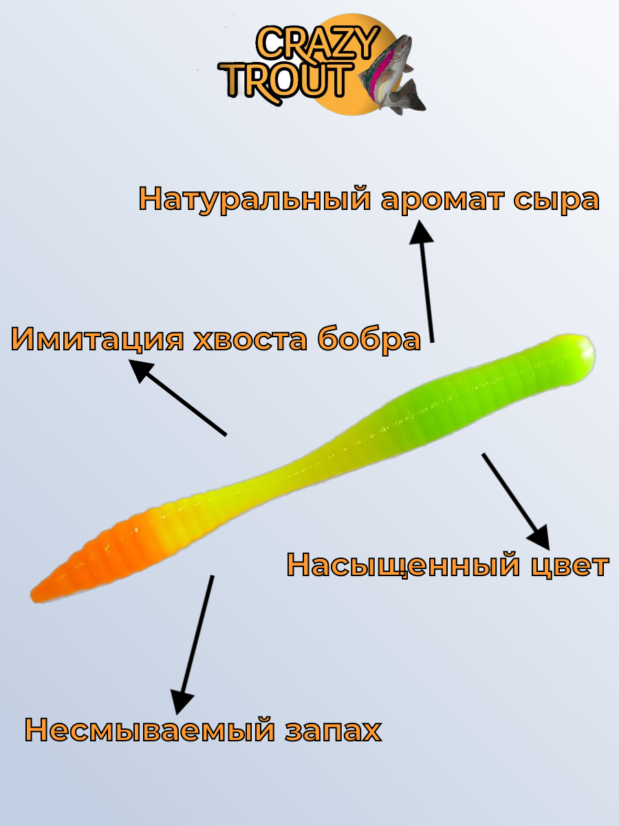 СохранитьCRAZY TROUT / Силиконовая приманка для ловли форели WORM, шартрез/лимон/оранж интересное: