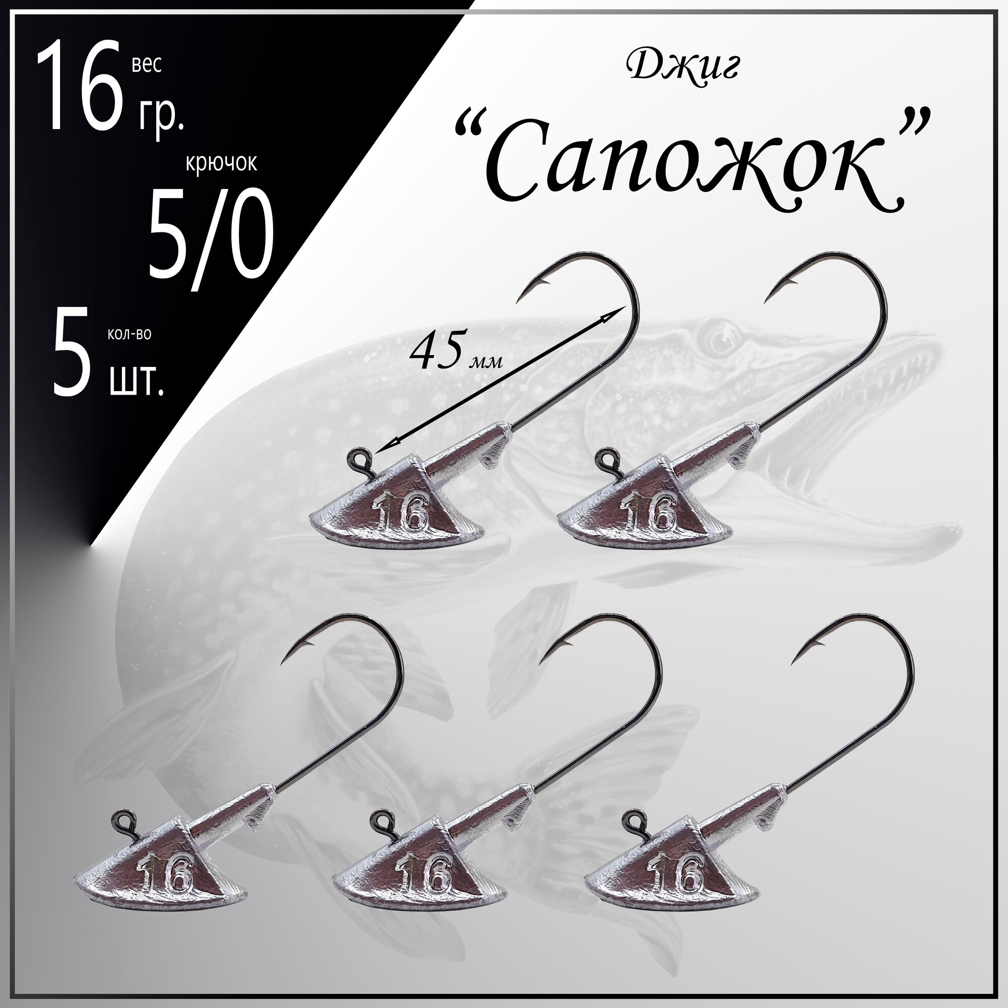 Джиг-головка "Сапожок" 16 гр. (крючок № 4/0), (в уп. 5 шт.)