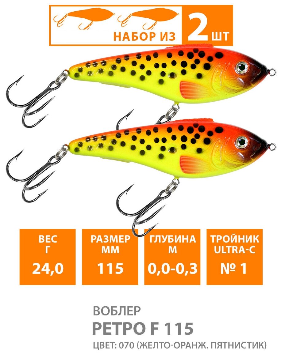 Купить Воблер для рыбалки плавающий AQUA Ретро 115mm 24g. Приманка джеркбейт на спиннинг, на щуку, судака, окуня цвет 070 2шт