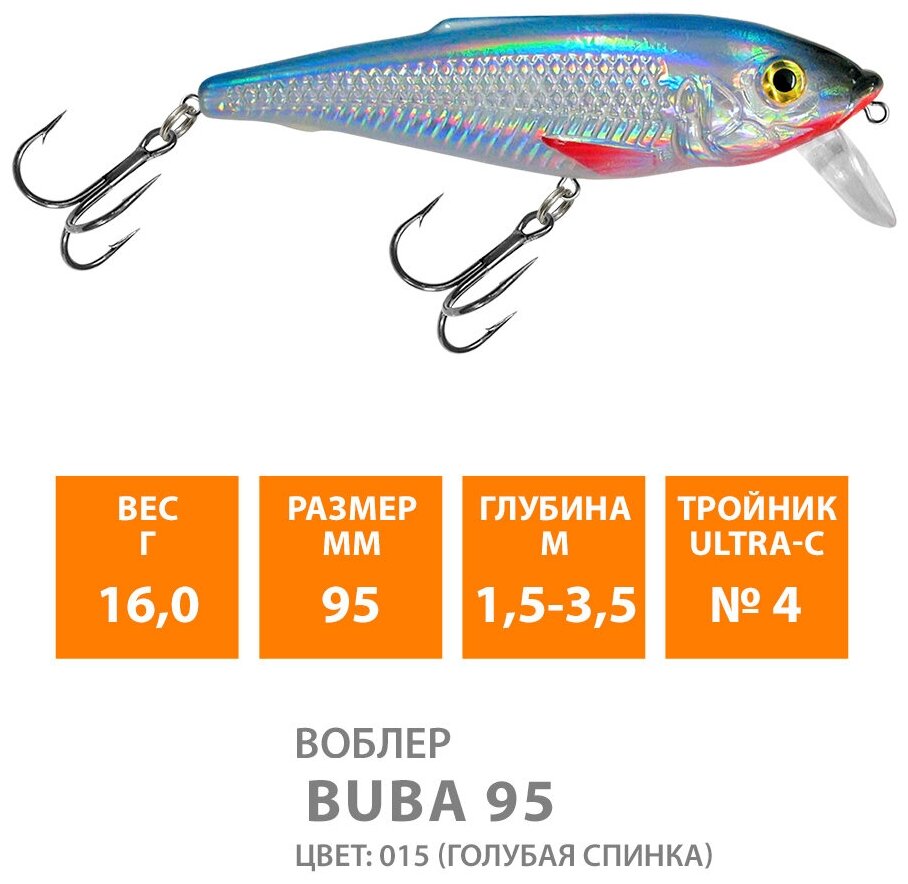 Ниже Вы можете прочитать отзывы на Воблер для рыбалки плавающий AQUA Buba 95mm 16g заглубление от 1.5 до 3,5m цвет 015, ознакомится с подробными характеристиками, посмотреть интересные обзоры и фотографии на Воблер для рыбалки плавающий AQUA Buba 95mm 16g заглубление от 1.5 до 3,5m цвет 015.