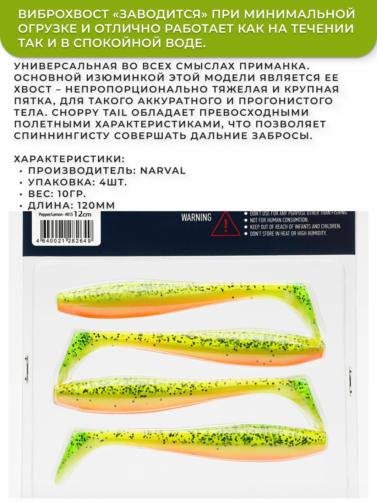 Ниже Вы можете прочитать отзывы на Приманка силиконовая Narval Choppy Tail 12cm #015-Pepper/Lemon / Мягкая приманка для джига, ознакомится с подробными характеристиками, посмотреть интересные обзоры и фотографии на Приманка силиконовая Narval Choppy Tail 12cm #015-Pepper/Lemon / Мягкая приманка для джига.