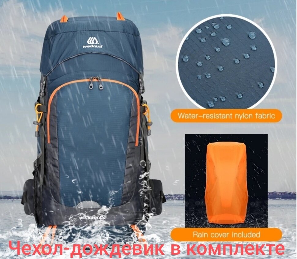 Большой трекинговый рюкзак Weikani для путешествий, походов, кемпинга 65 литров с дождевиком цвет синий
