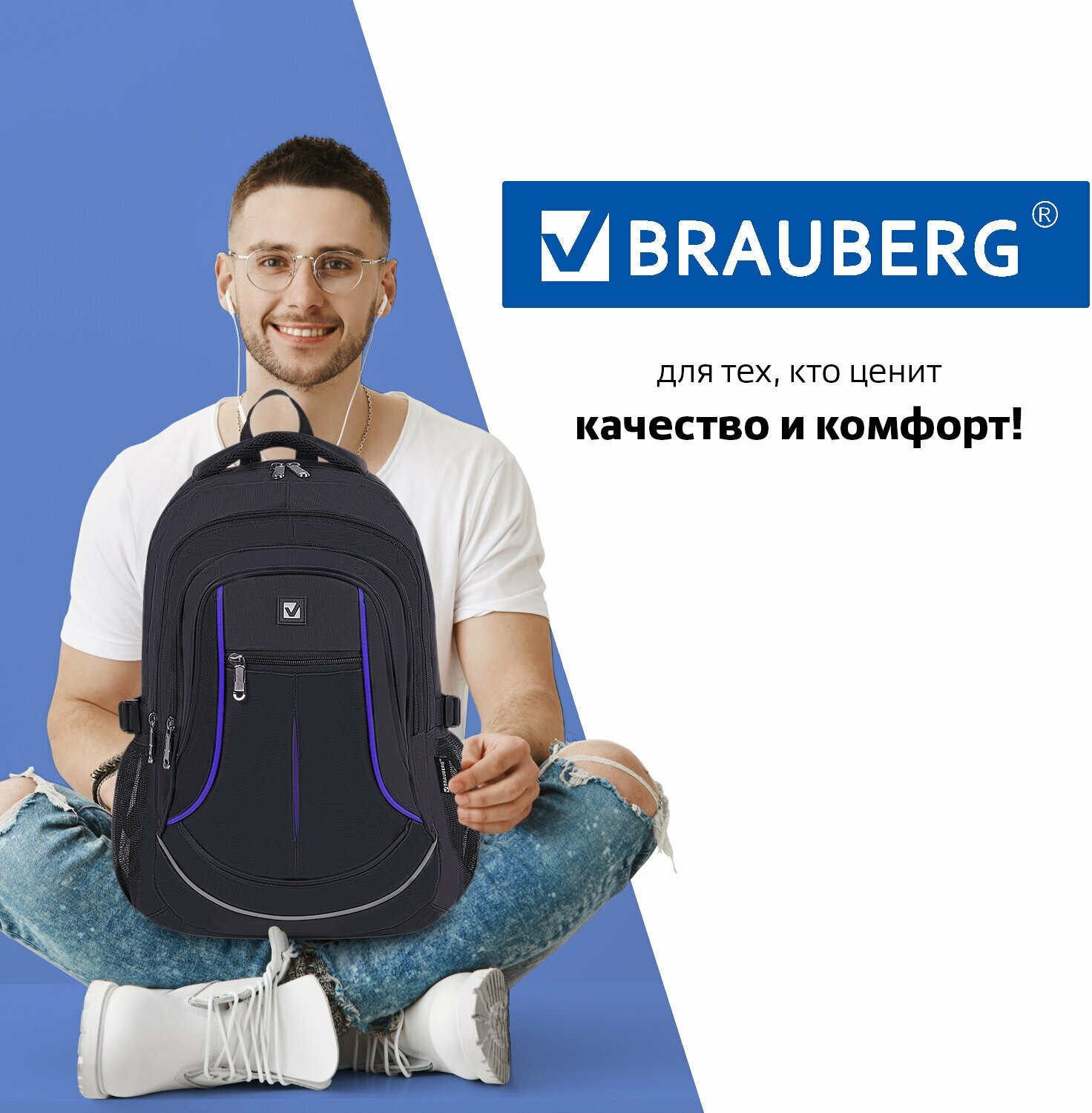 Купить Рюкзак / ранец / портфель школьный, подростковый для мальчика / девочки вместительный Brauberg, 3 отделения, черный, синие детали, 46х31х18см, 271652