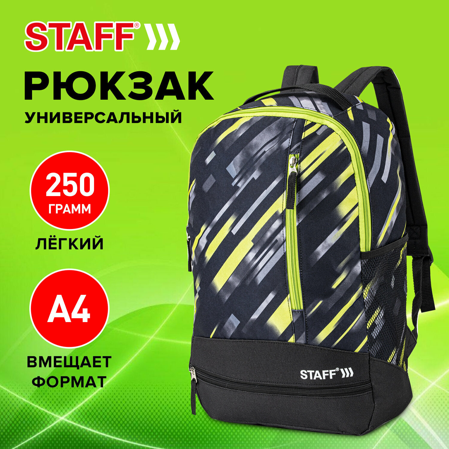 Рюкзак женский мужской, школьный спортивный городской, для подростка черный с салатовыми деталями, 3 кармана, 45х27х12 см, Staff Strike, 270785