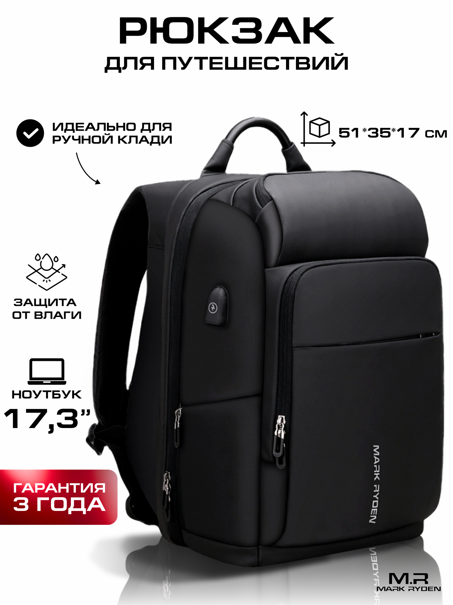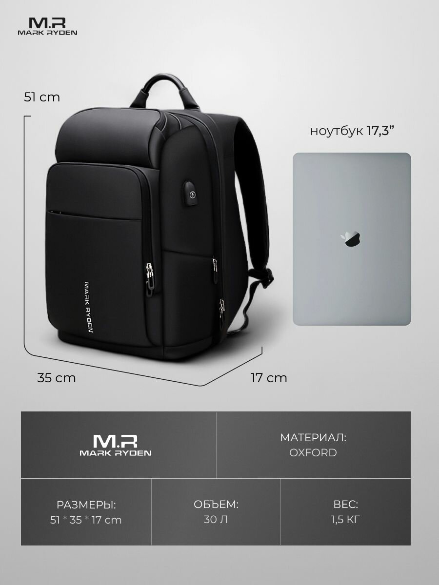 Рюкзак городской дорожный мужской Mark Ryden вместительный 30л, для ноутбука 17.3", непромокаемый, с USB зарядкой черный