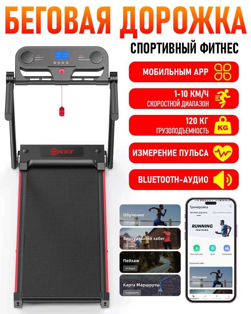 Беговая дорожка, РК ЛОГ P5, мобильным APP, мониторинг сердечного ритма, скорость 1-10 км/ч, максимальная нагрузка 120 кг, динамик Bluetooth интересное: