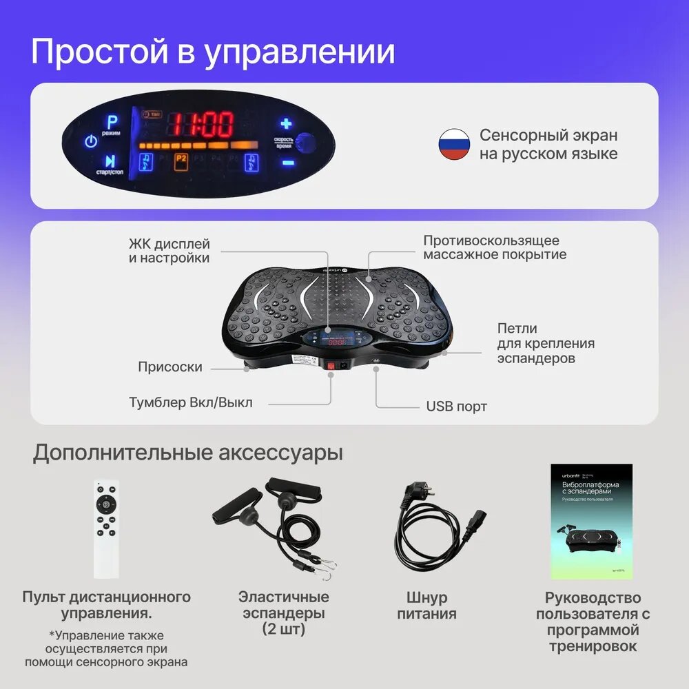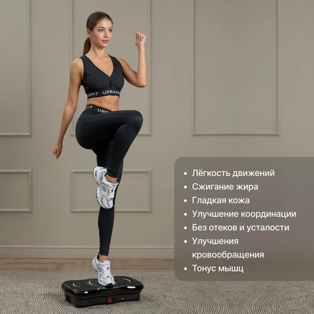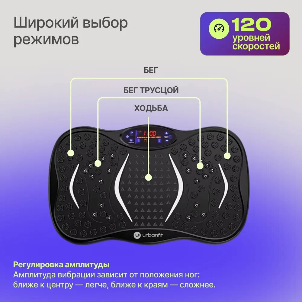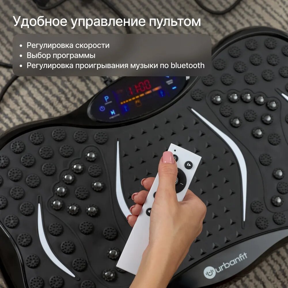 Виброплатформа Urbanfit с bluetooth, эспандерами и пультом ДУ, 120 скоростей, 5 режимов, черный интересное: