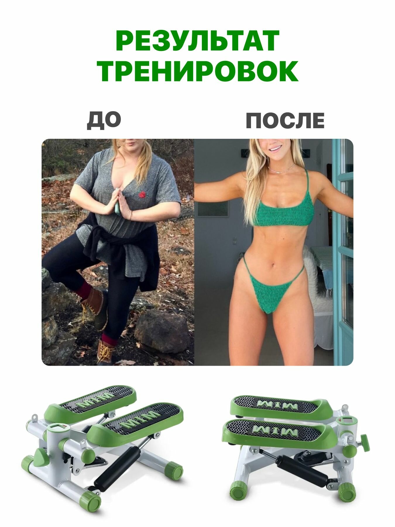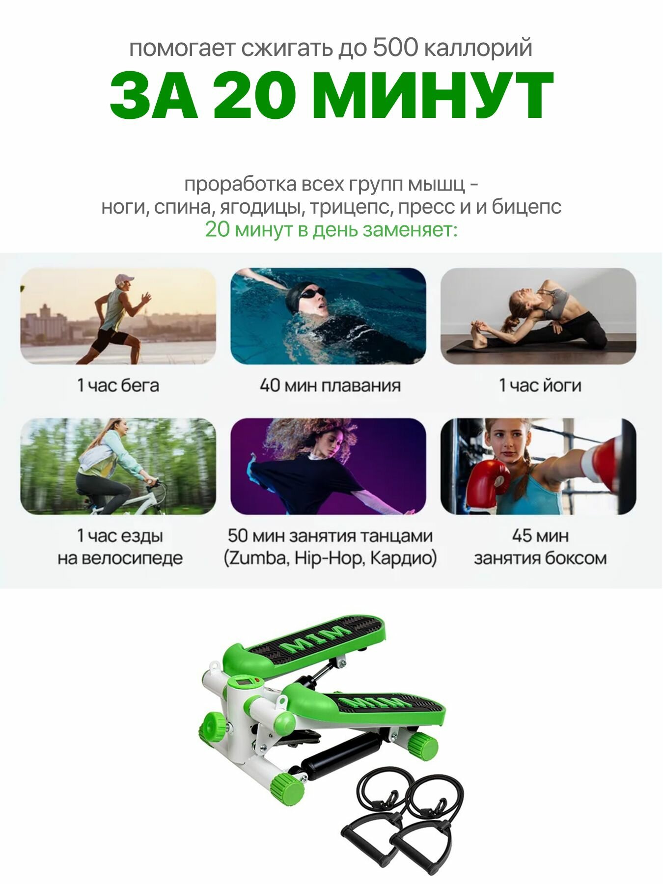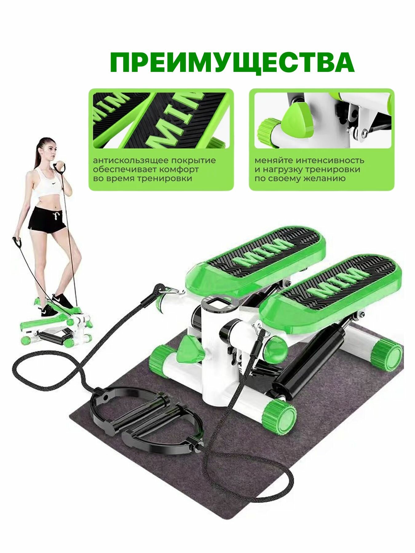 Степпер с эспандерами С1 для рук, ног и ягодиц / Мини тренажер для дома для похудения, зеленый интересное: