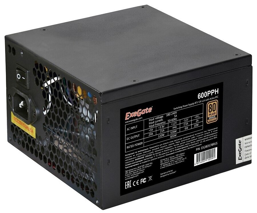 Блок питания 600W ExeGate 80 PLUS® Bronze 600PPH (ATX, APFC, КПД 89% (80 PLUS Bronze), 12cm fan, 24pin, 2x(4+4)pin, 4xPCI-E, 6xSATA, 3xIDE, black, Color Box) EX280578RUS