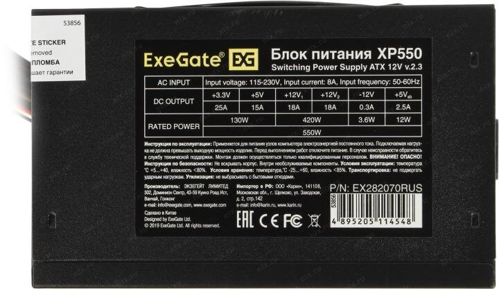 Exegate EX282070RUS-PC Блок питания 550W ExeGate XP550 (ATX, PC, 12cm fan, 24pin, 4pin, PCIe, 3xSATA, 2xIDE, black, кабель 220V в комплекте)