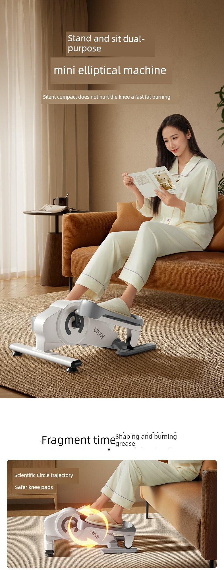Мини Эллиптический Тренажер для Дома, Бесшумный, Лунный Белый с Текстурой Дерева C3L