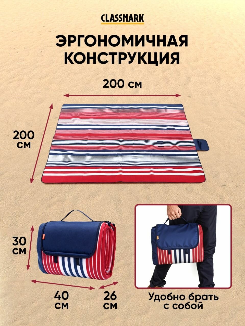Пляжный коврик Classmark 200х200 см, складной, для пикника и отдыха на природе, для песка и гальки интересное: