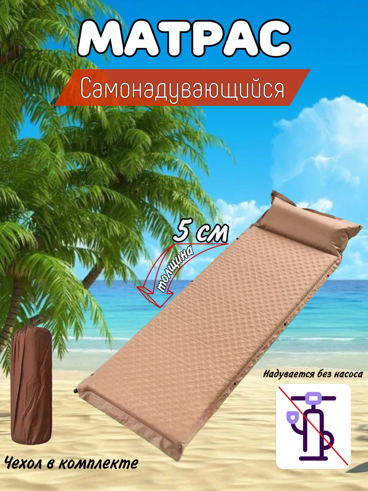 Самонадувающийся туристический коврик, двухместный, бежевый 5 см