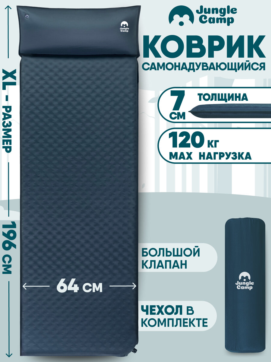 Коврик самонадувающийся кемпинговый с подушкой двухспальный JUNGLE CAMP Dreamer Double 70, толщина 7 см