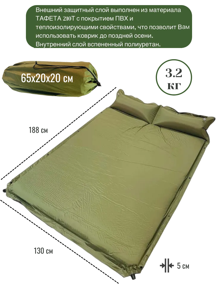 Туристический матрас двухместный, самонадувающийся, надувной коврик, походный, 188x130x5 см Цвет зеленый интересное: