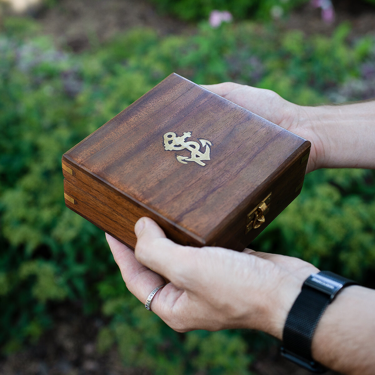 Компас на цепочке с изображением "идущего в даль" в деревянной шкатулке с якорем