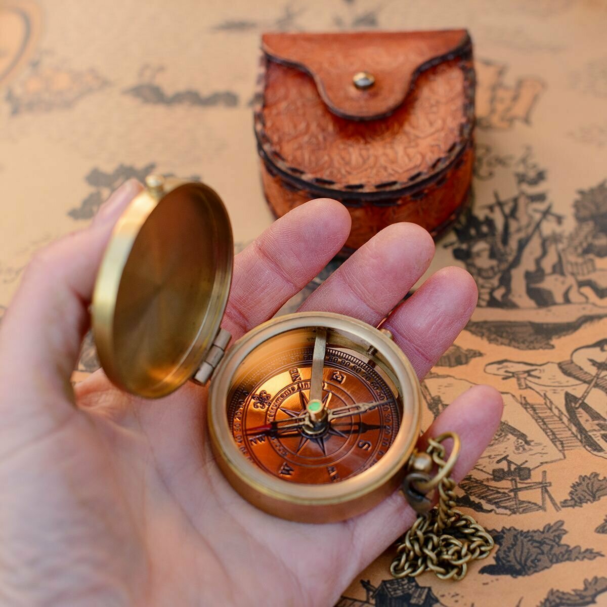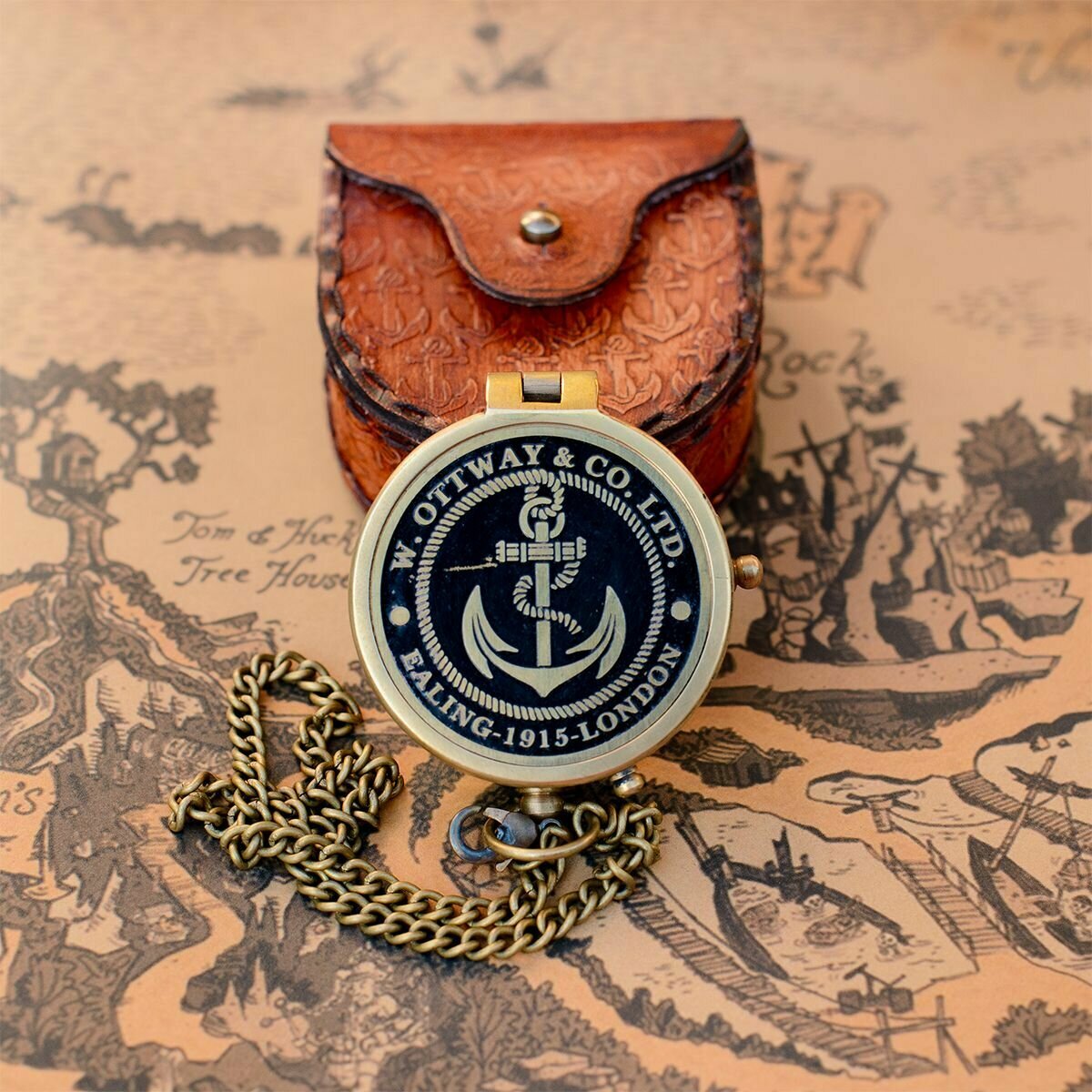 Компас на цепочке с изображением "карты" в деревянной шкатулке с якорем
