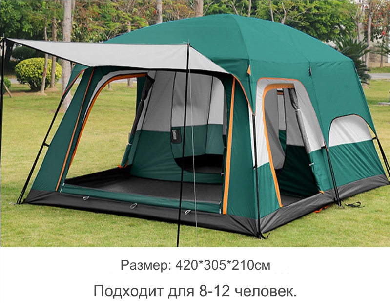 Туристическая палатка от 4 до 12 человек / Двухкомнатная палатка для отдыха, рыбалки, охоты / Кемпинговая палатка-шатер 430х305х200 см интересное: