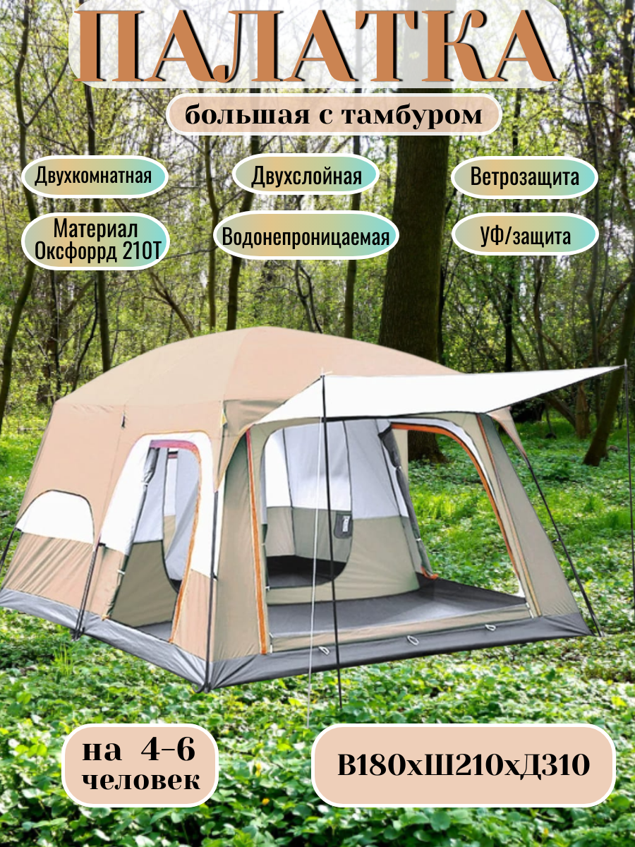 Туристическая двухкомнатная палатка на 4-6 человек Палатка с большим тамбуром и полом, 310х210х180 см, бежевый интересное: