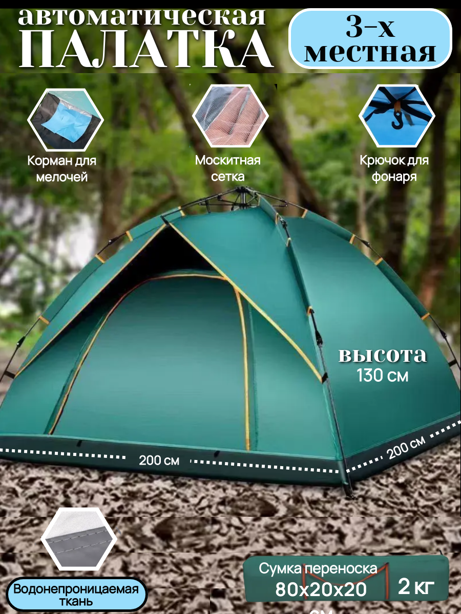 Палатка туристическая / Палатка автоматическая, 3-х местная, зеленая, 200х200х130 см интересное: