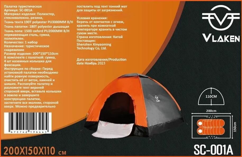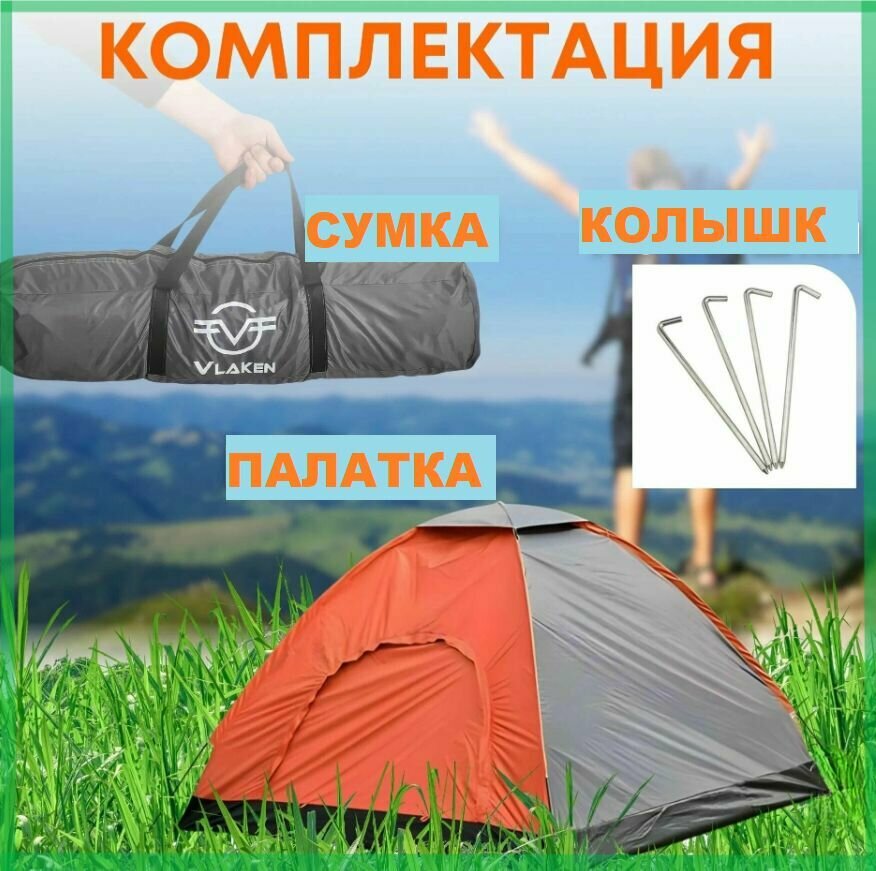Купить Палатка туристическая однослойная 2х - местная VLAKEN 200*150*110cm /Палатка для туризма, отдыха и рыбалки