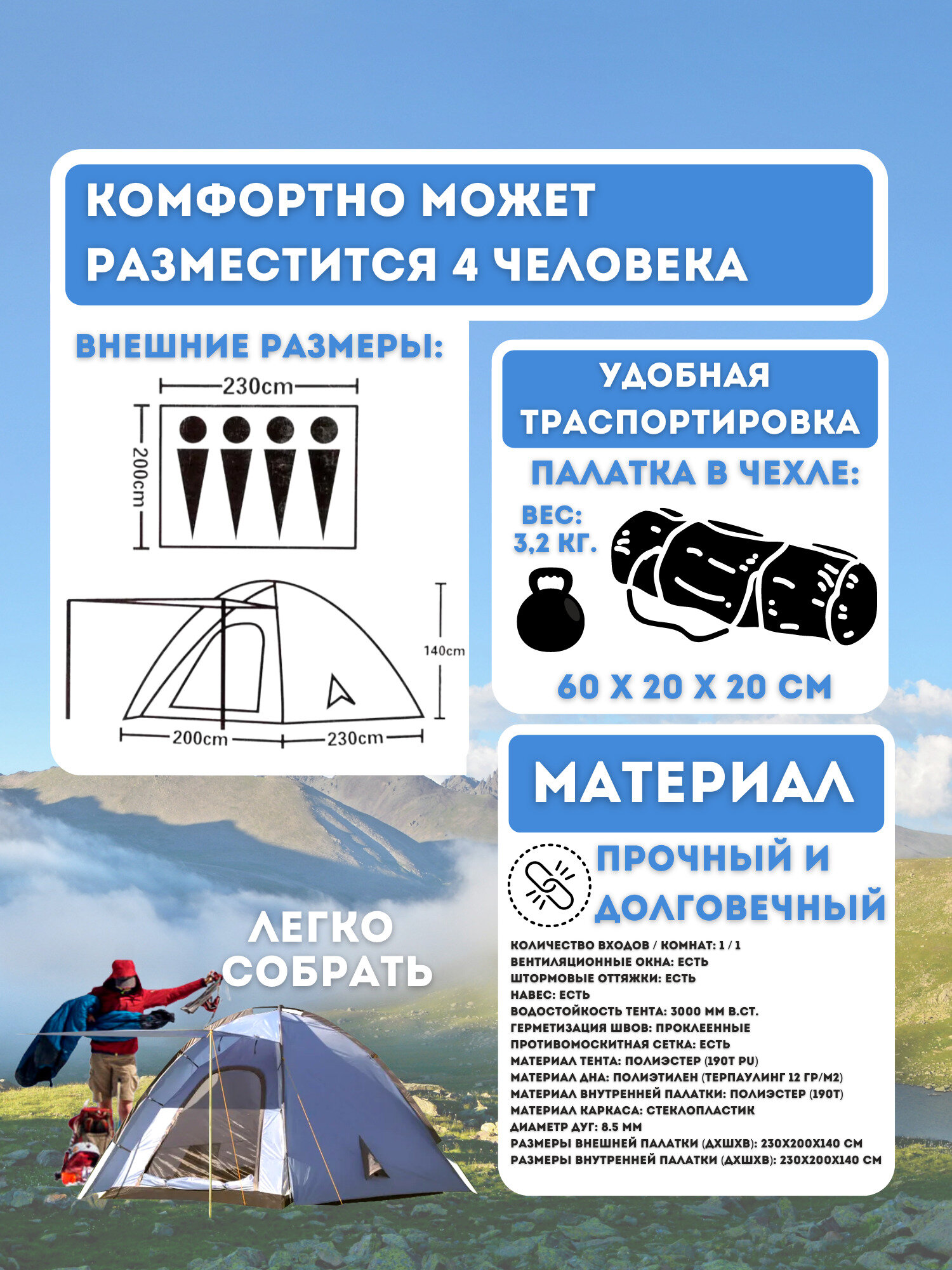 Купить Палатка кемпинговая четырехместная LANYU LY-1932 синий /Палатка / Туристическая / Для туризма / Двухслойная / С тамбуром / Палатка / Кемпинг / Рыбалка