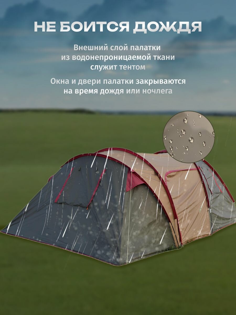 Палатка туристическая 4 местная, с тамбуром, двухслойная, кемпинговая, 1915