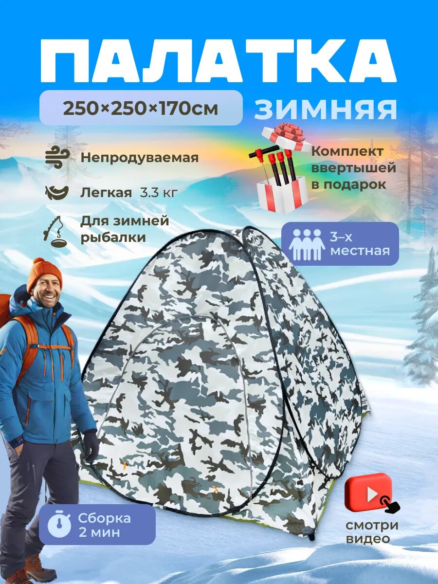 Палатка YinFish "ПЗ Белый КМФ" 2.5 x 2.5 м, зимняя, кемпинговая, с клапаном под лунки, 3-местная интересное: