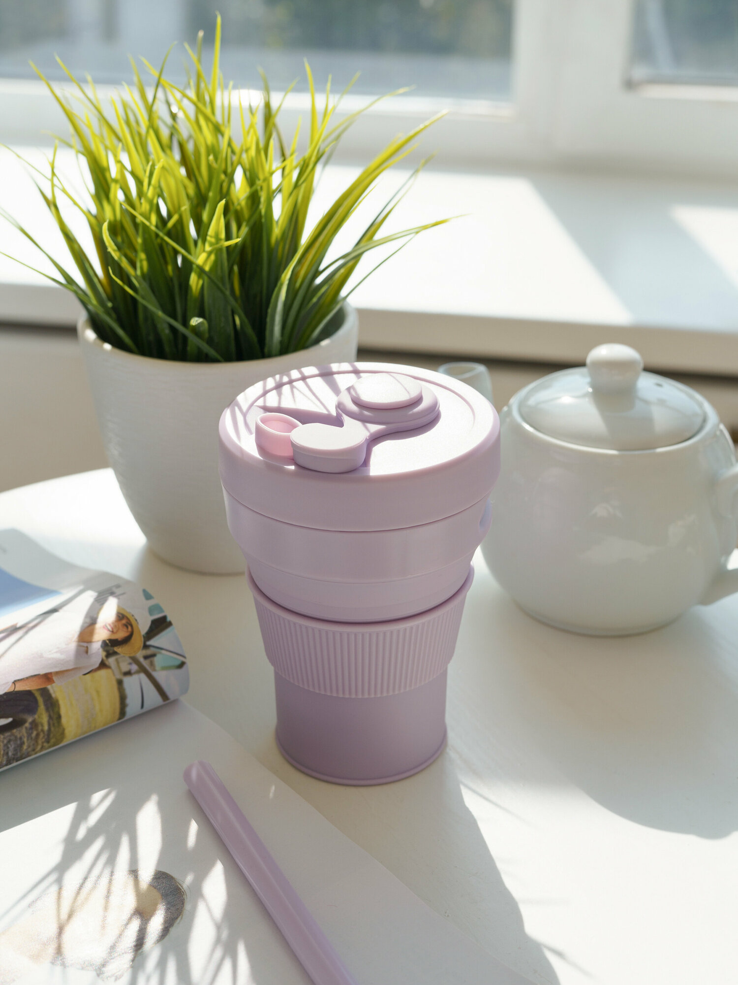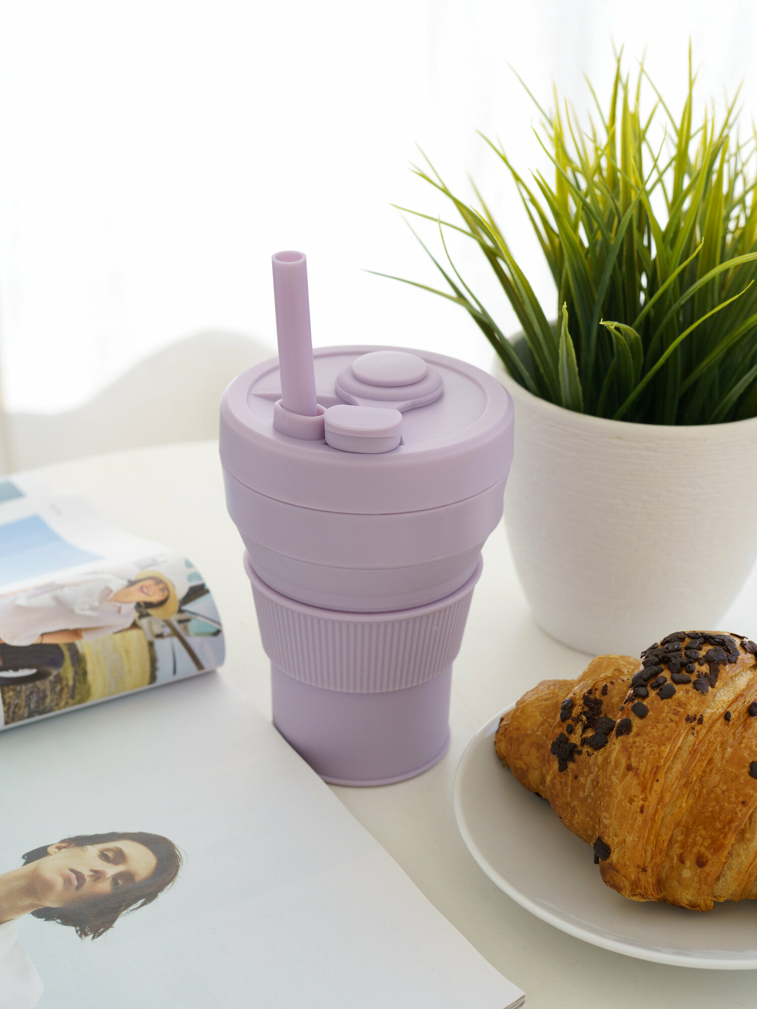 Купить Cкладной стакан силиконовый с крышкой и трубочкой, цвет светло-фиолетовый, Purple, 450 мл.