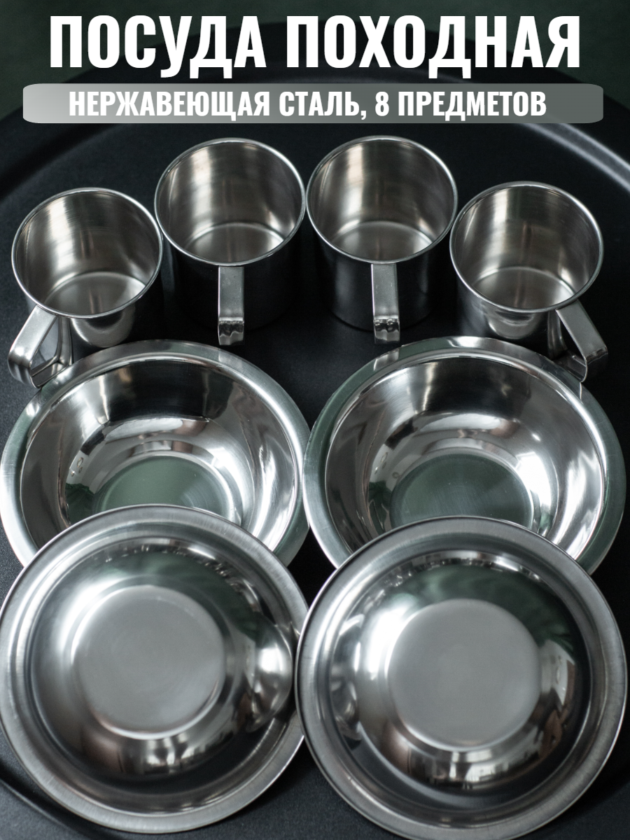 Походный набор туристической посуды, нержавеющая сталь, 4 персоны, 8 предметов. интересное: