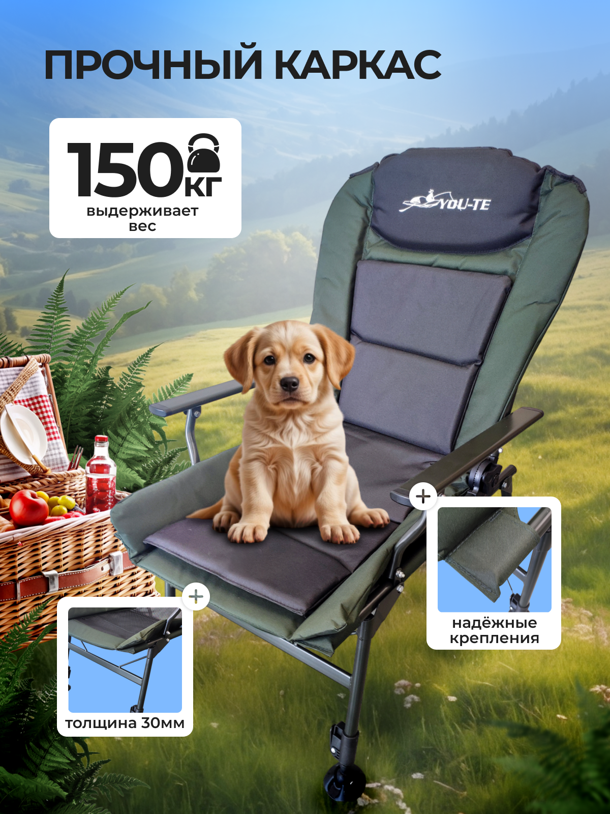 Кресло BIRDS AND FISH, карповое, для рыбалки, складное, туристическое, 180кг, зеленое