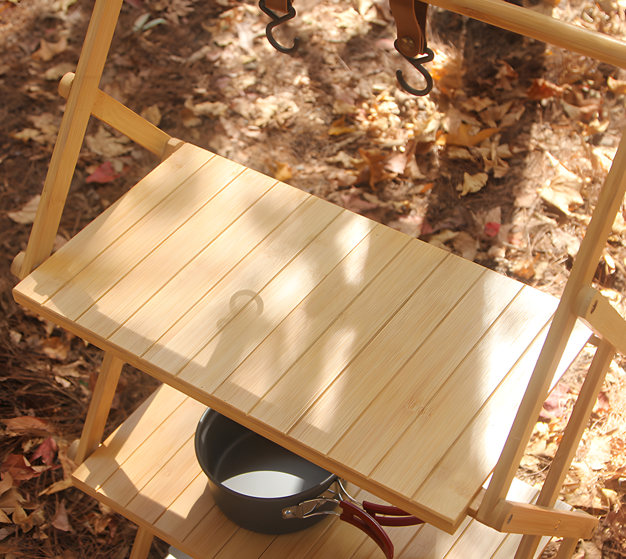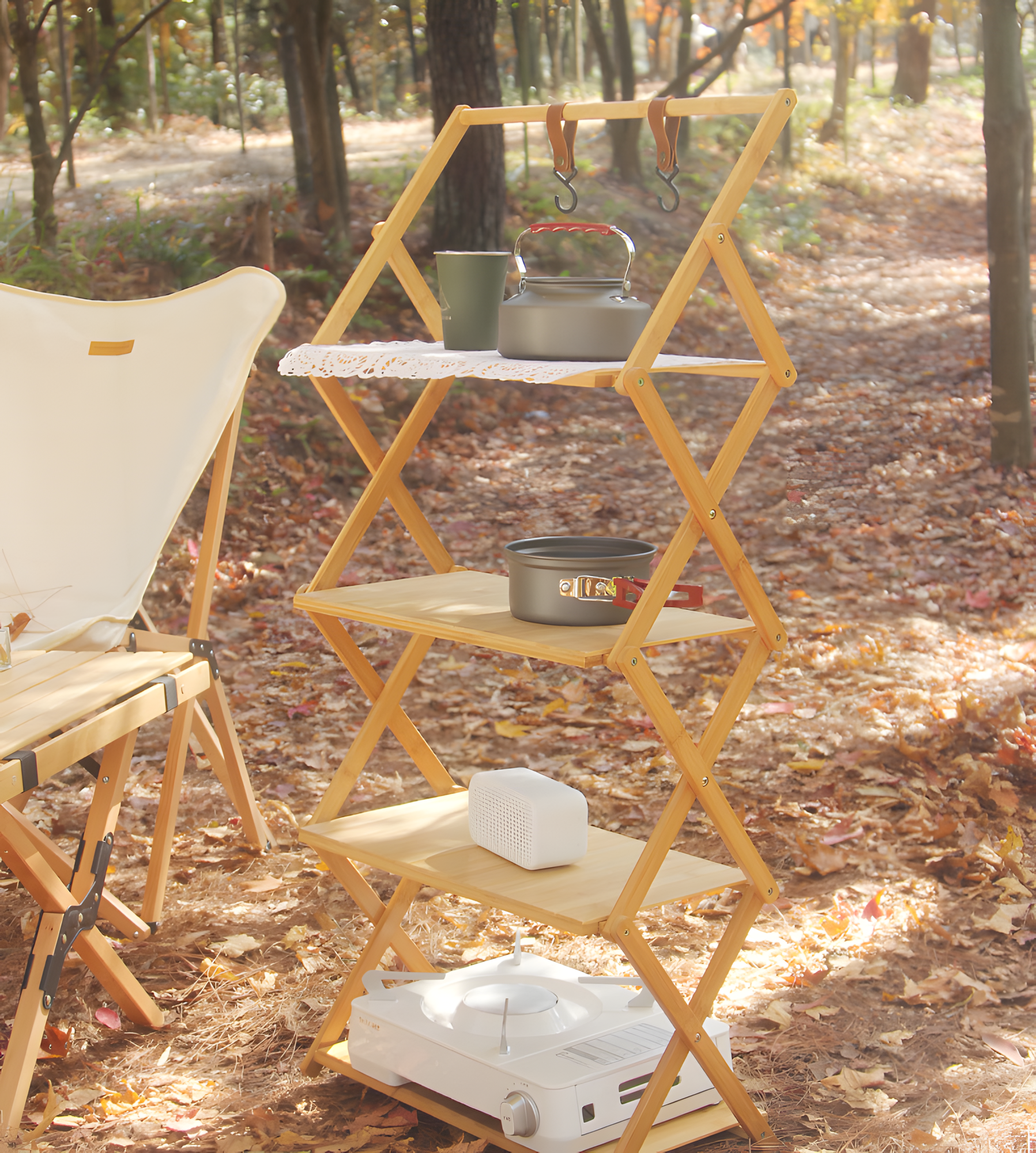 Складной туристический стеллаж из бамбука, 3 полки и перекладина, натуральный, 84х70 см