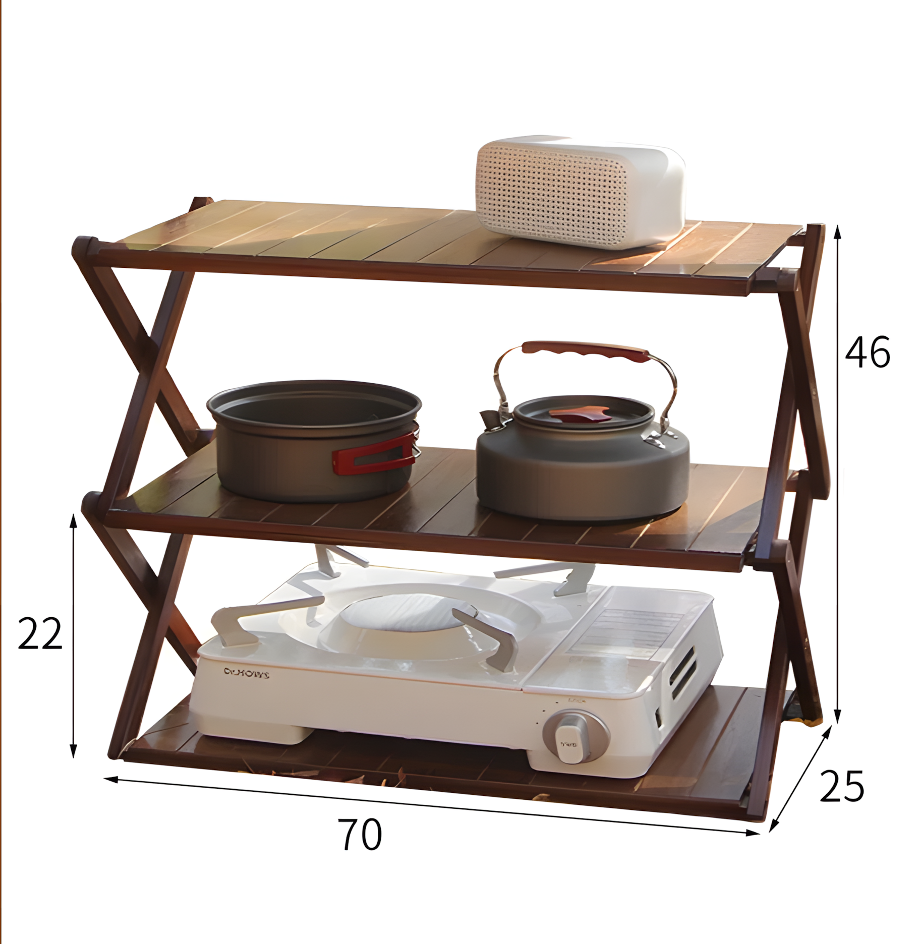 Складной туристический стеллаж из бамбука, 3 полки и перекладина, ореховый, 84х70 см