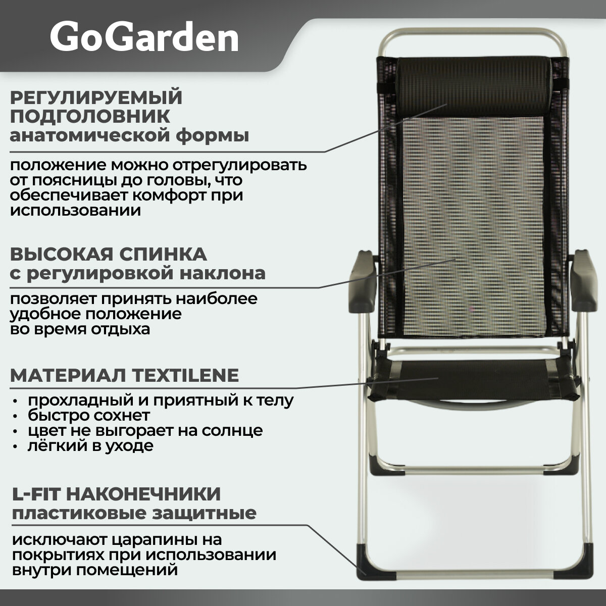 Кресло садовое складное GoGarden SUNDAY. Регулировка спинки 5 позиций, подлокотники, съемный подголовник. Нагрузка 100 кг интересное: