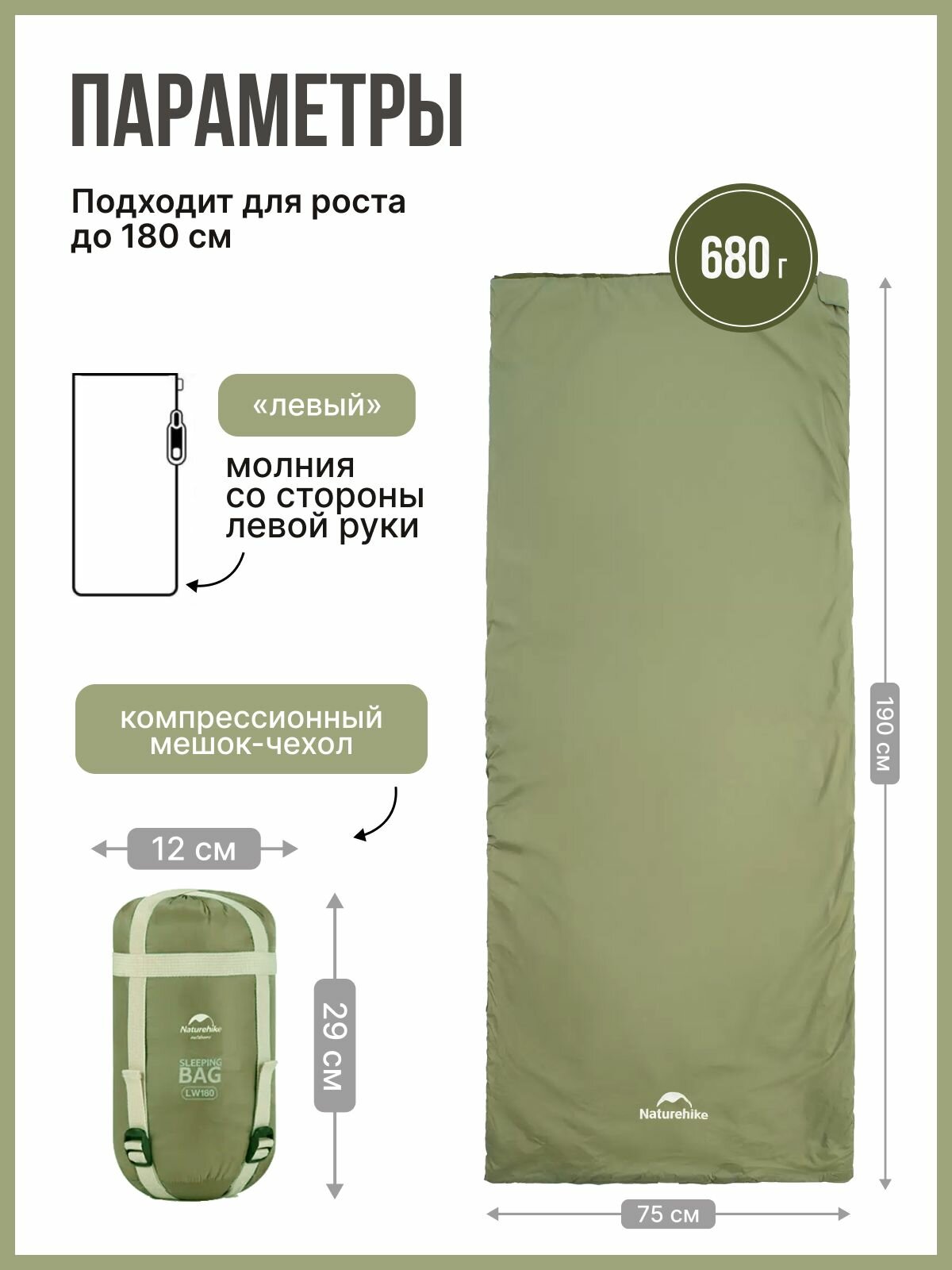 Купить Мешок спальный Naturehike LW180 NH21MSD09 190х75 см, зеленый, молния слева