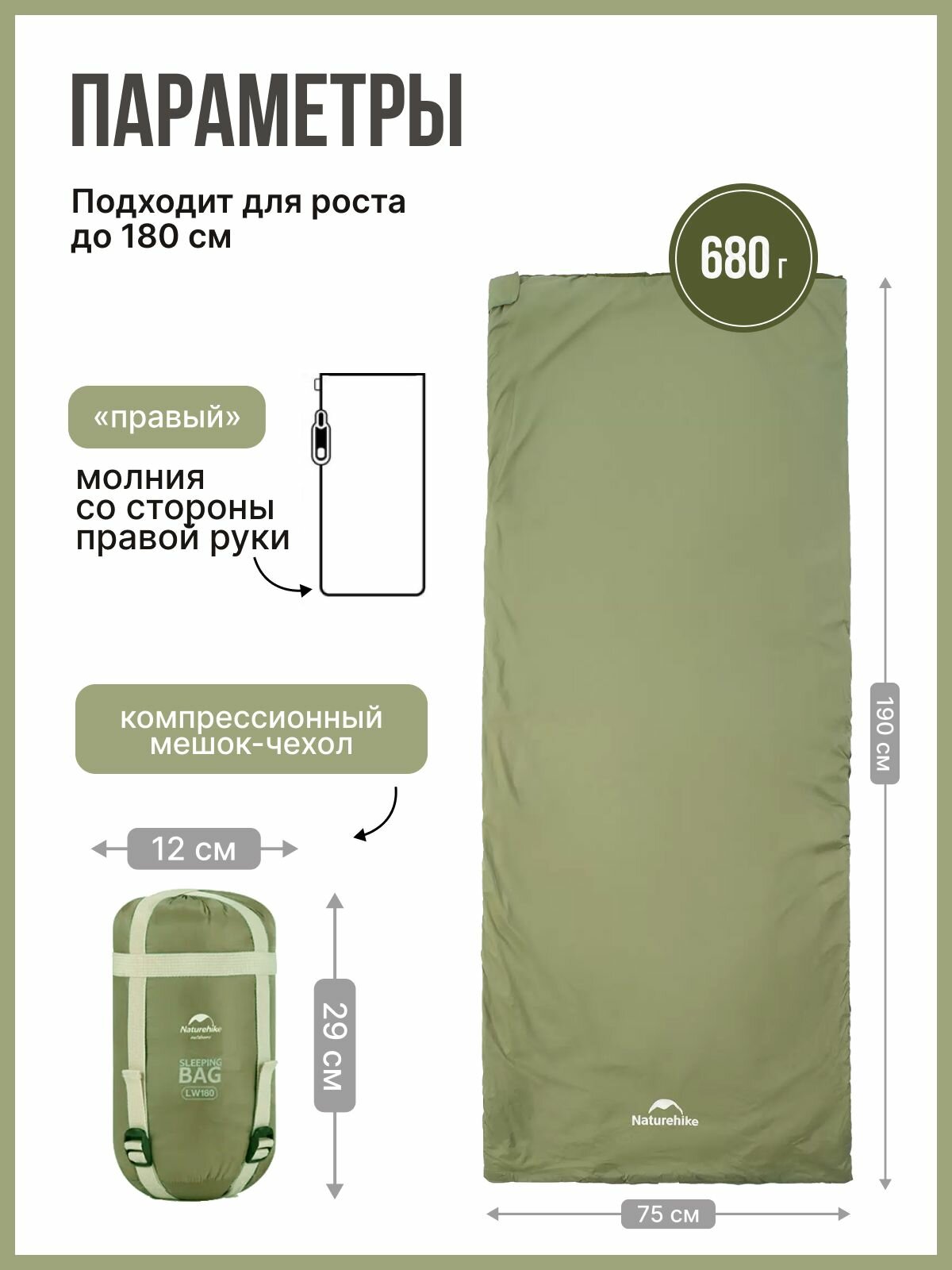 СохранитьМешок спальный Naturehike LW180 NH21MSD09 190х75 см, зеленый, молния справа интересное: