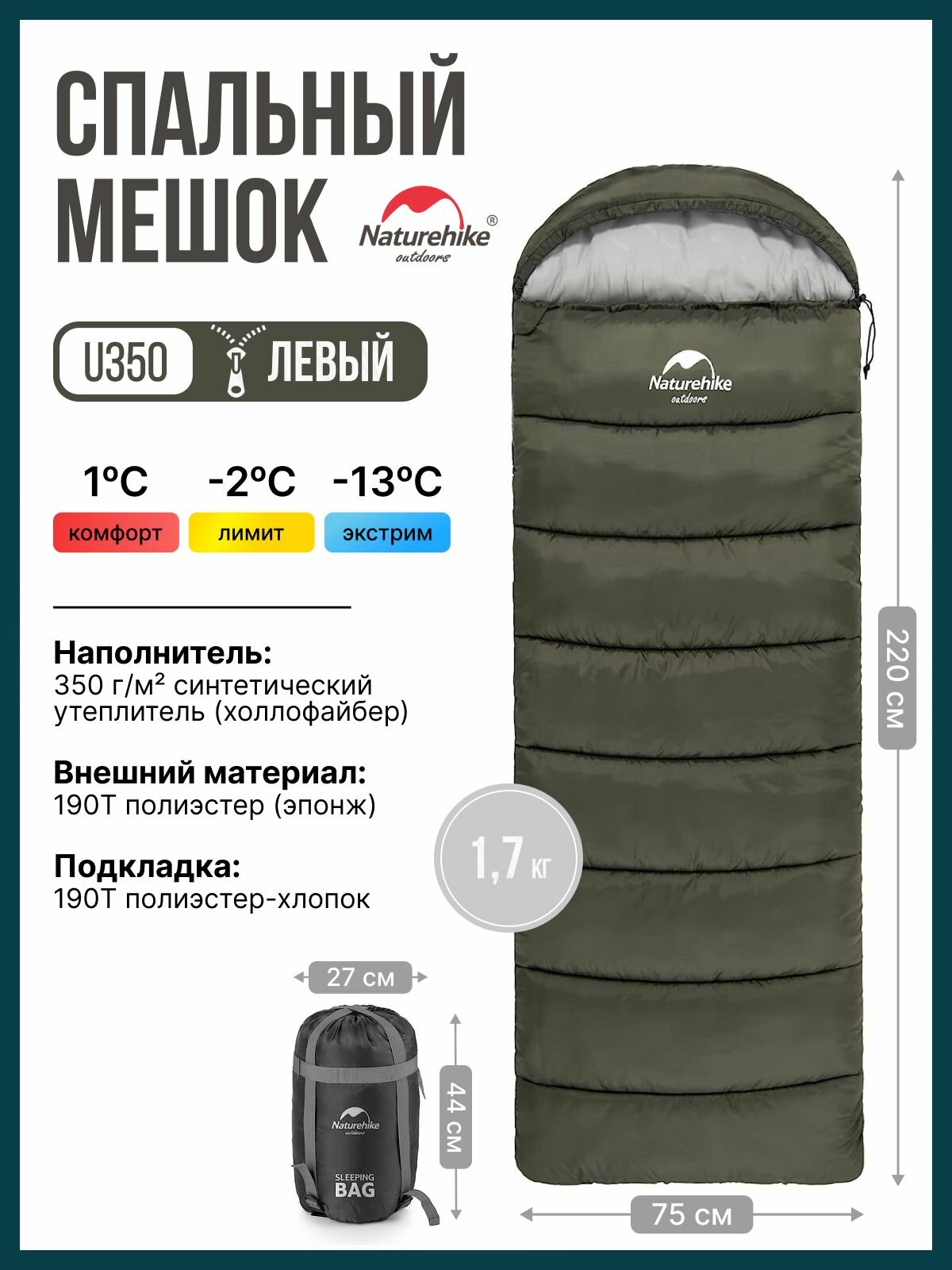 Купить Мешок спальный Naturehike U350 NH20MSD07 220х75 см, темно-зеленый, молния слева