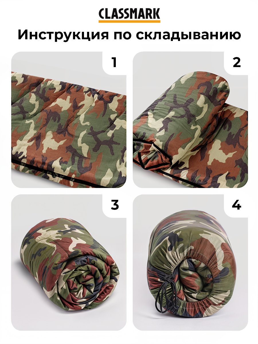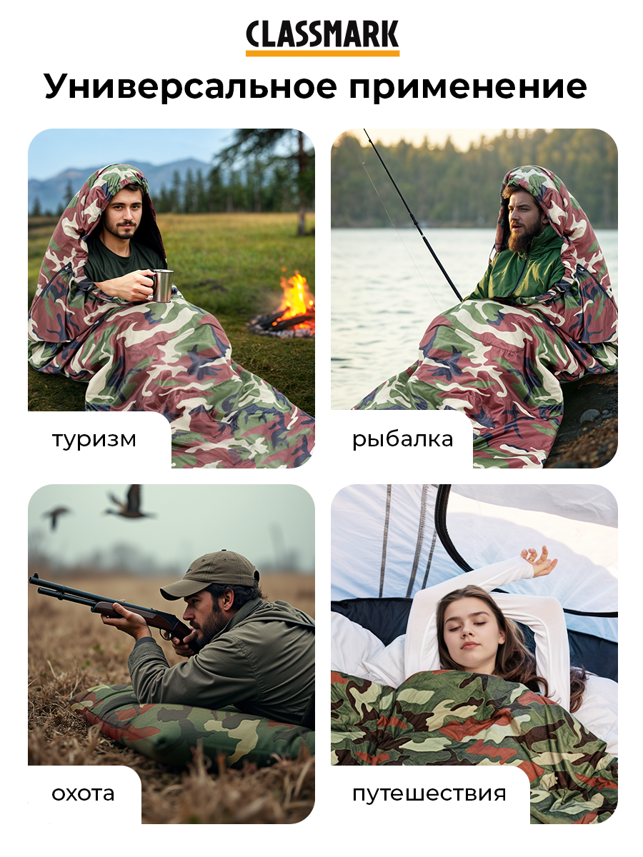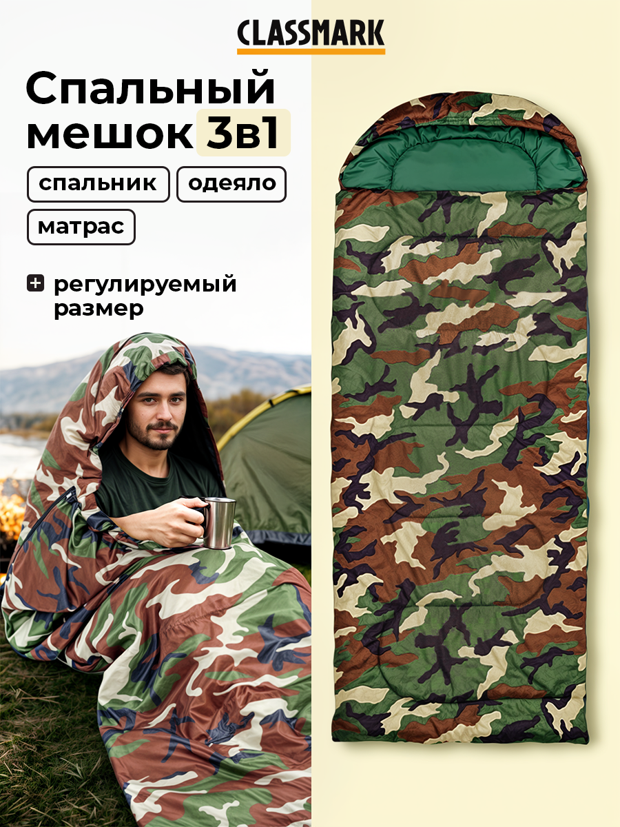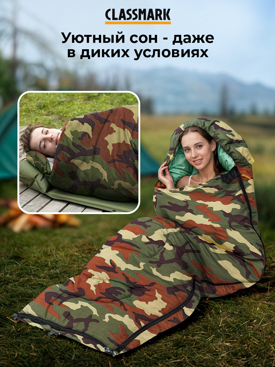 Купить Спальный мешок туристический с капюшоном Classmark 210 см, Одеяло, для рыбалки, охоты, активного отдыха и похода / Камуфляжный