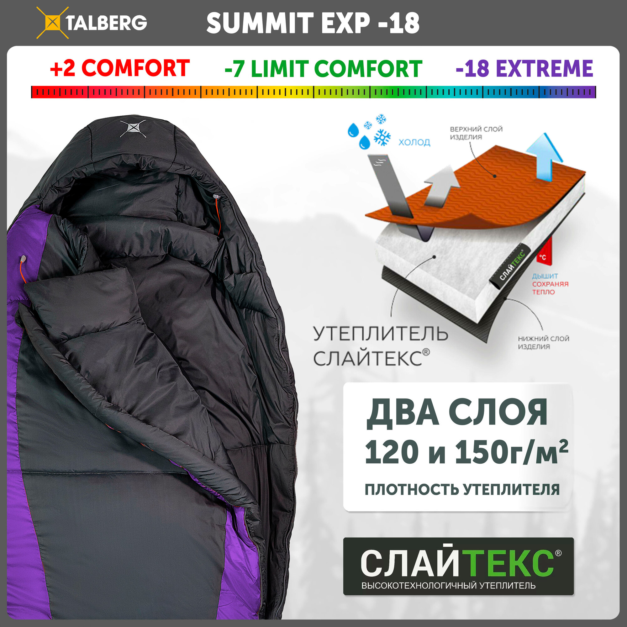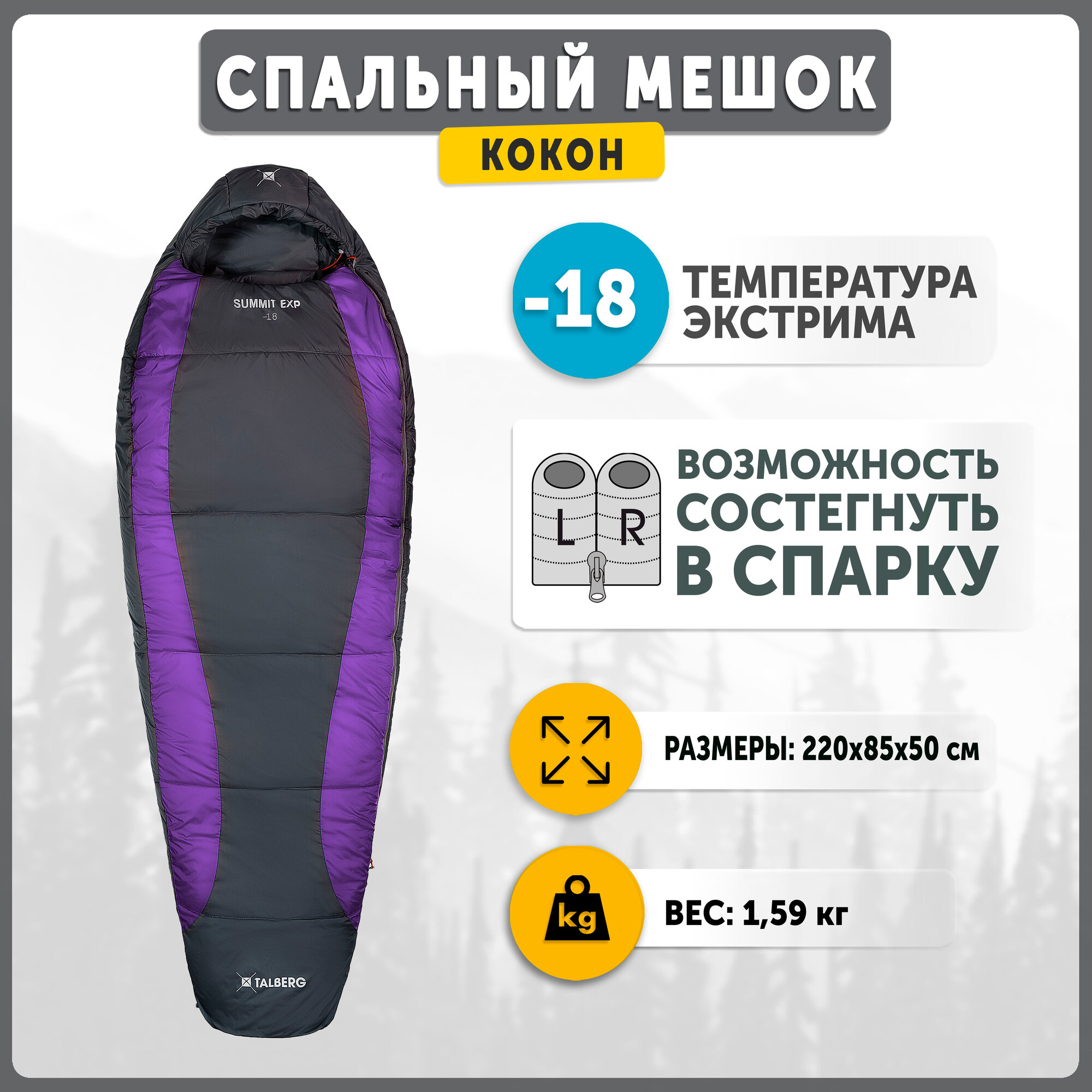 Спальный мешок-кокон Talberg SUMMIT EXP -18°C, серый/фиолетовый правый интересное: