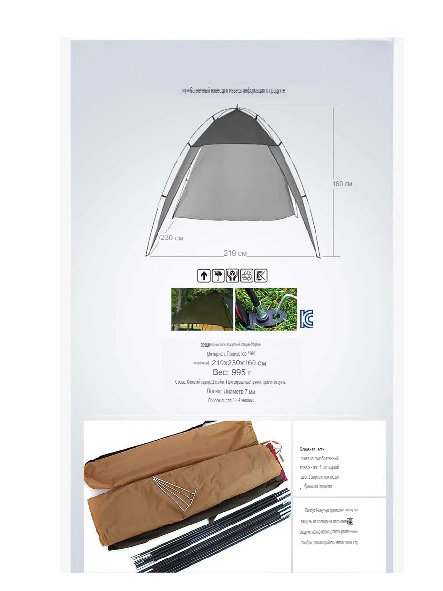 Пляжная палатка CoolWalk, тент, шатровый, быстросборный, водонепроницаемый, 210х230х160 см, серый интересное: