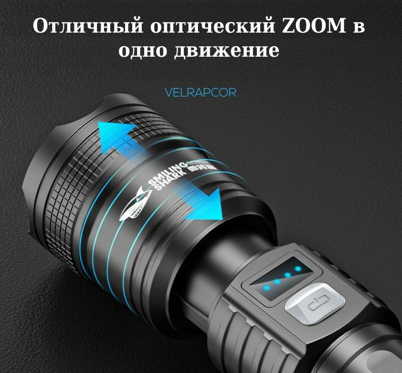 Фонарик чёрный, дальность освещения 300м, время работы 14 часов, IP65, светодиоды интересное: