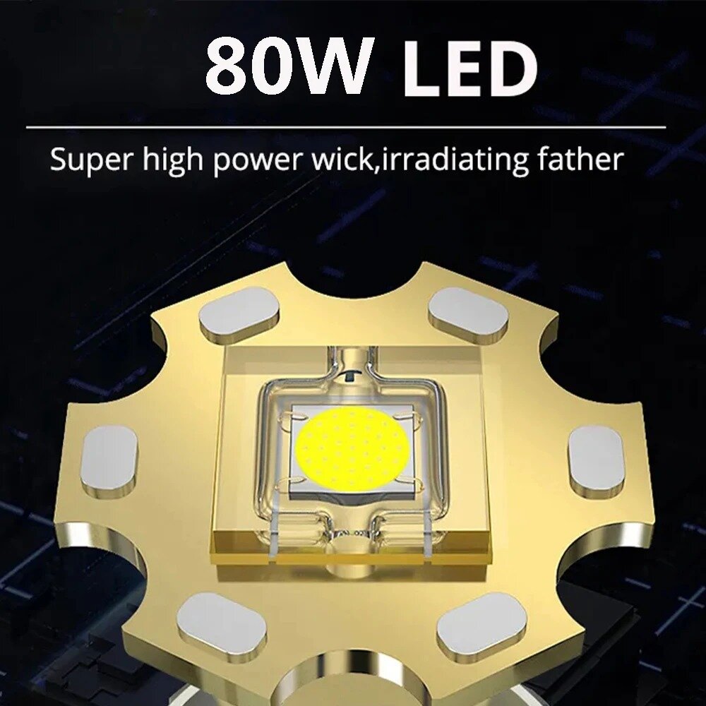 Светодиодный фонарь 80W светит далеко и ярко. Для тактических мероприятий, охоты, рыбалки, с цифровой индикацией заряда интересное: