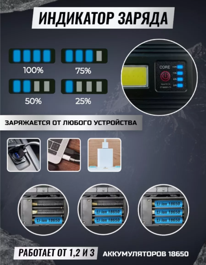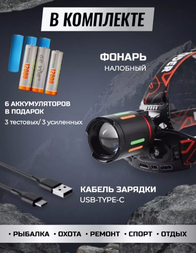 Налобный фонарик, с USB-зарядкой, 18000 люмен, дальность освещения 1600 метров интересное: