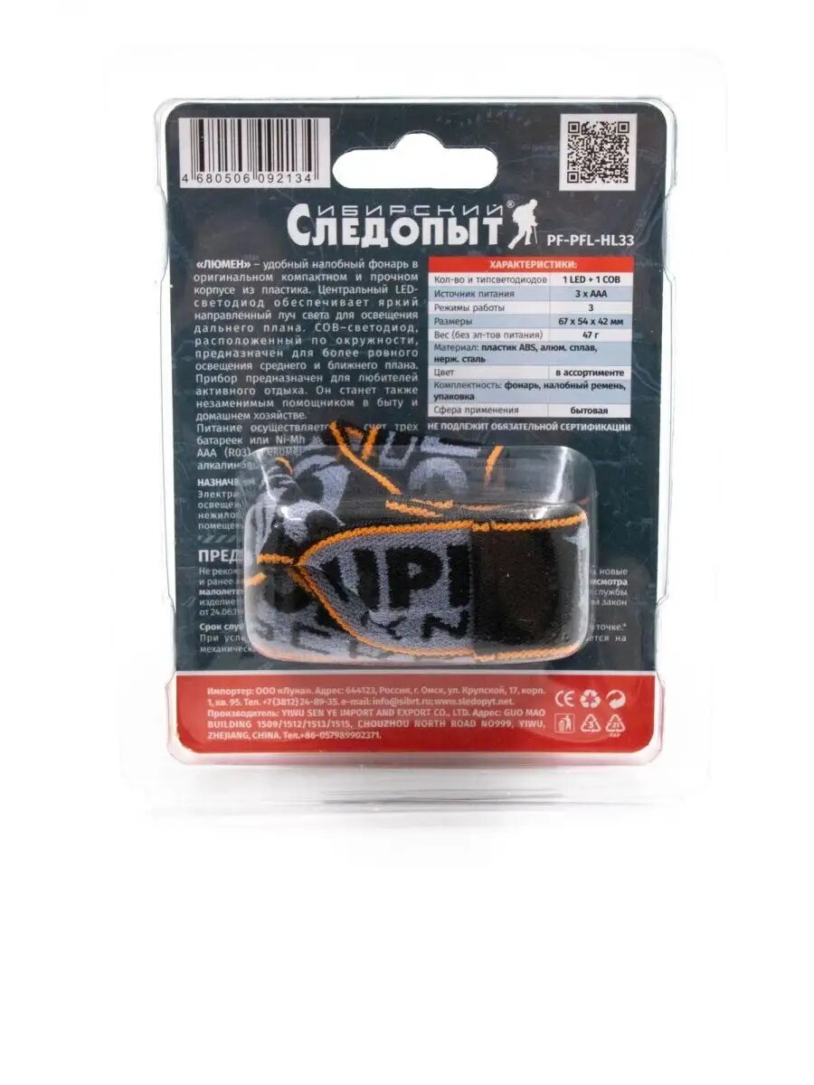 Налобный фонарь Сибирский Следопыт Луч-М, 400 люмен, 3 режима, чёрный
