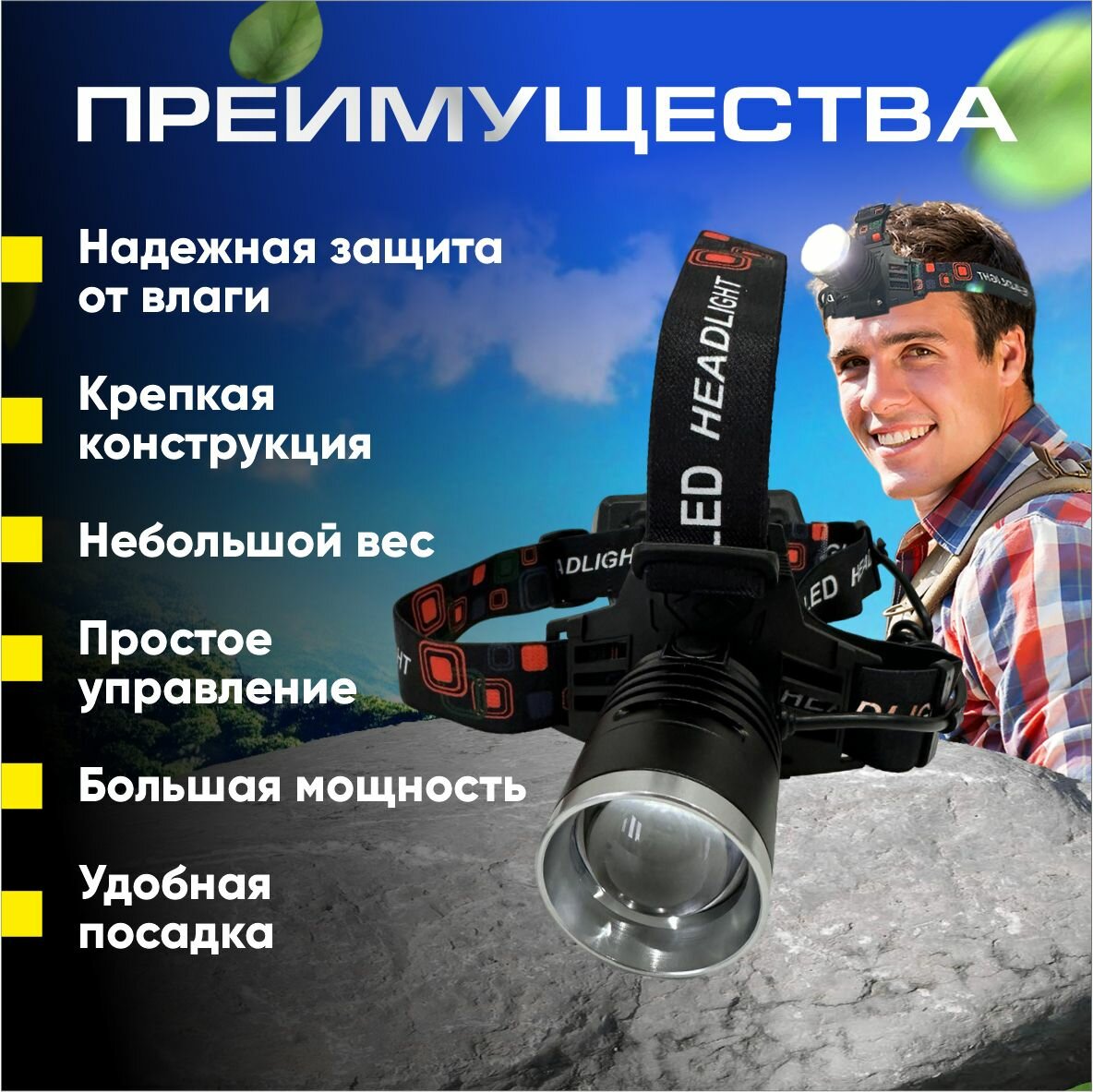 Фонарь налобный аккумуляторный /SheLiShop/ мощный, светодиодный с зумом, 5 режимов, с функцией powerbank интересное: