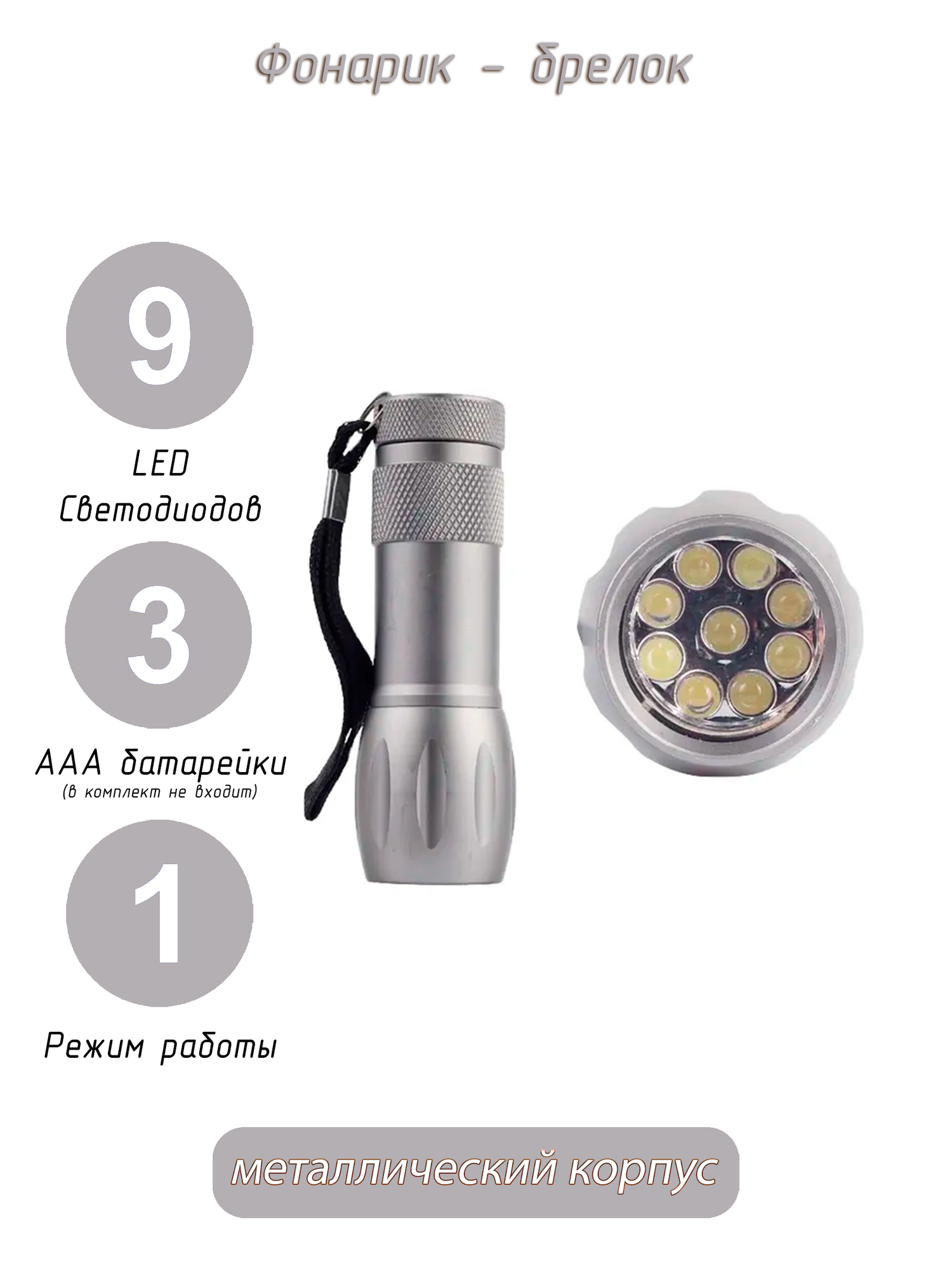 Портативный фонарик на батарейках, 3 AAA, 9 Вт, 9 LED светодиодный, 90 lm, серебристый интересное: